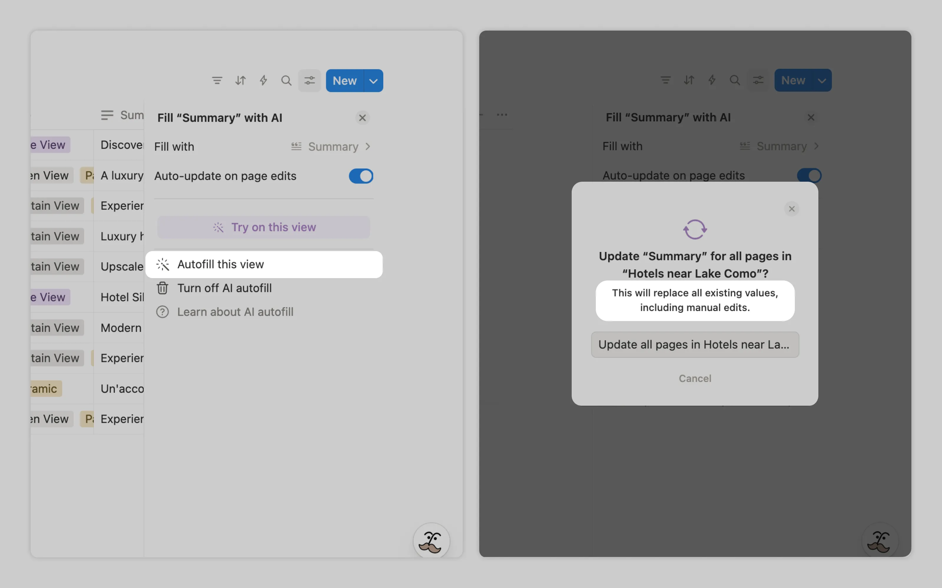 Notion protects human work by warning users that enabling auto-fill will overwrite all existing data in those fields, including manual edits.