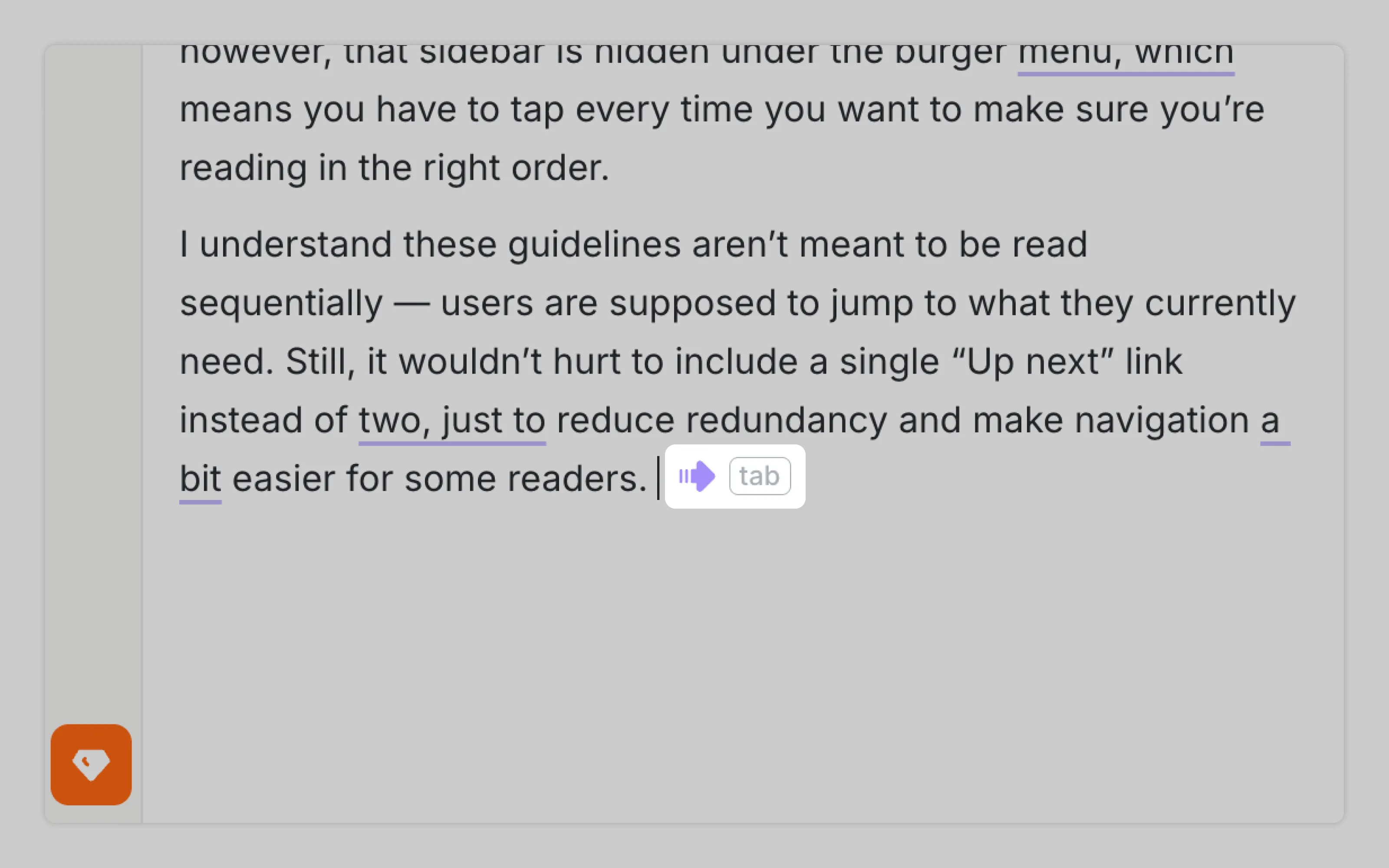 Wordtune uses a small arrow icon to indicate that AI can continue writing the next sentence, without interrupting the writing flow.