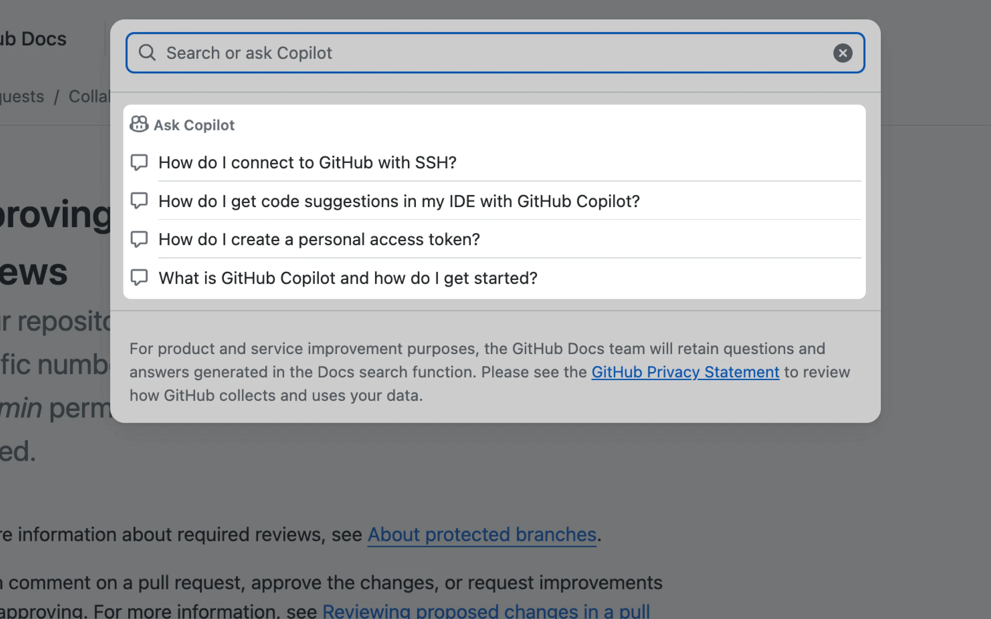 In GitHub Docs search, users are told they can ask Copilot instead of searching manually, supported by quick actions for common questions.