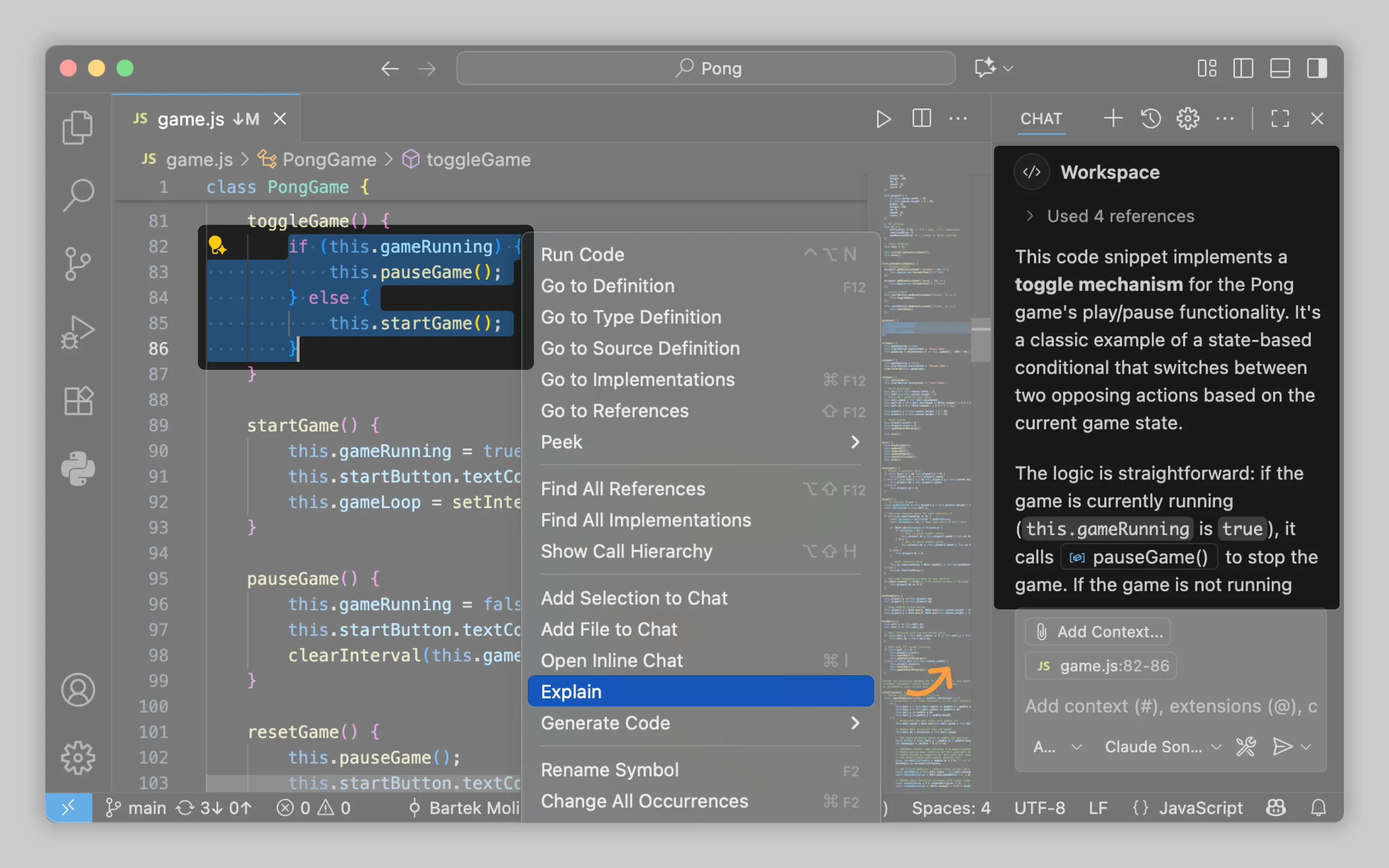 VS Code adds an "Explain" option to the context menu when users highlight code