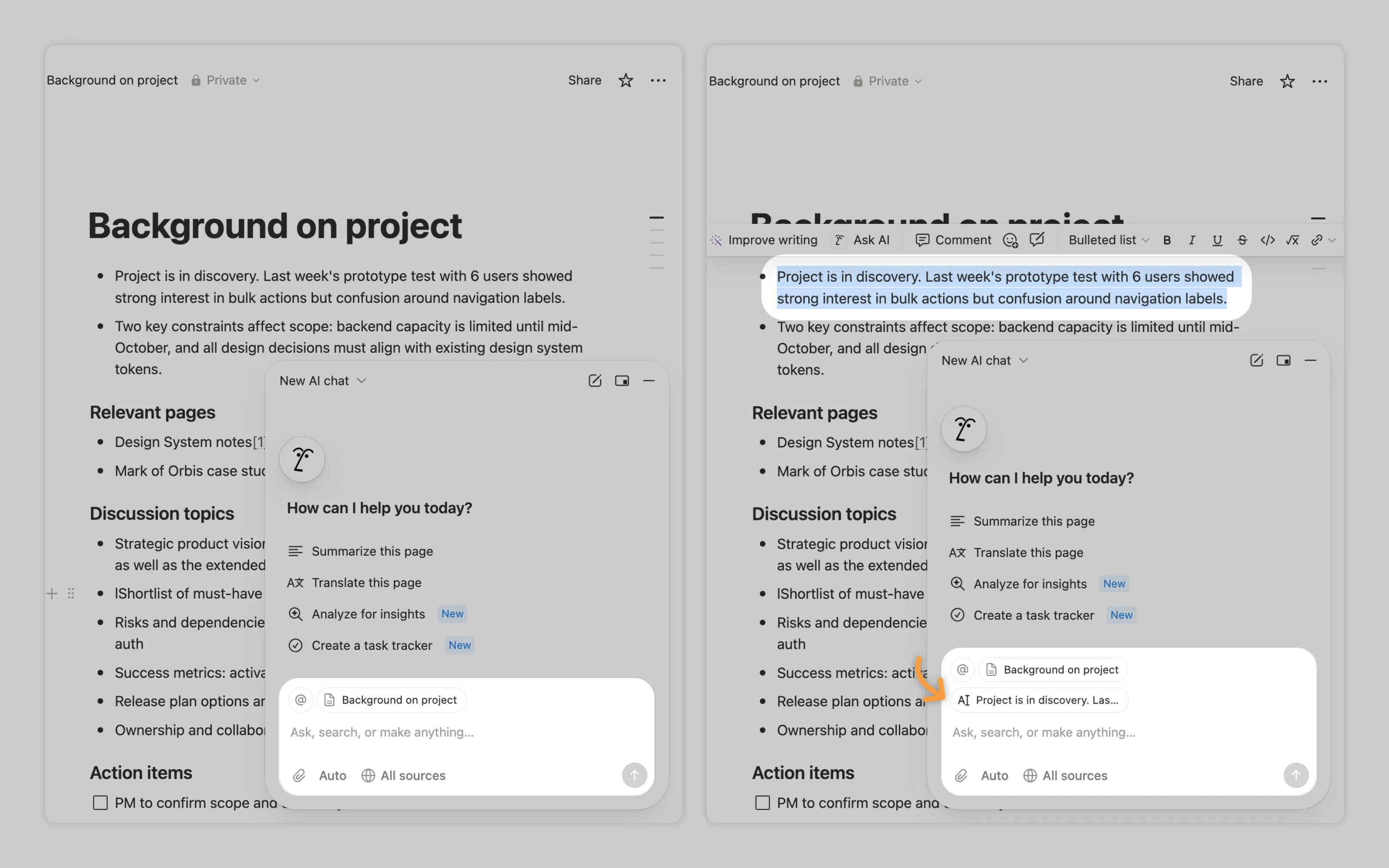 Notion automatically feeds highlighted text into AI chat as a reference point.