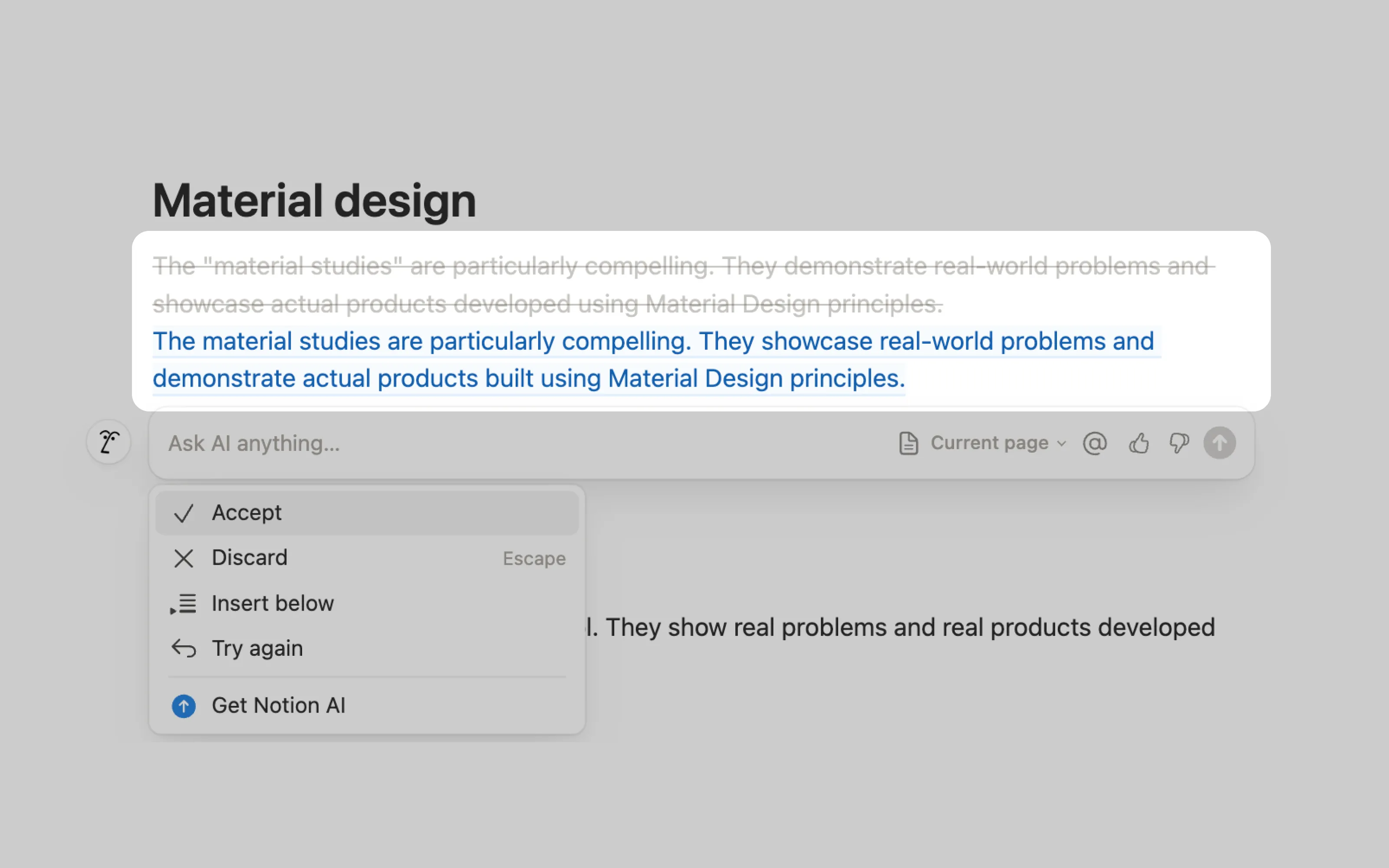 For single paragraph edits, Notion strikes through original text and displays the new version in blue.