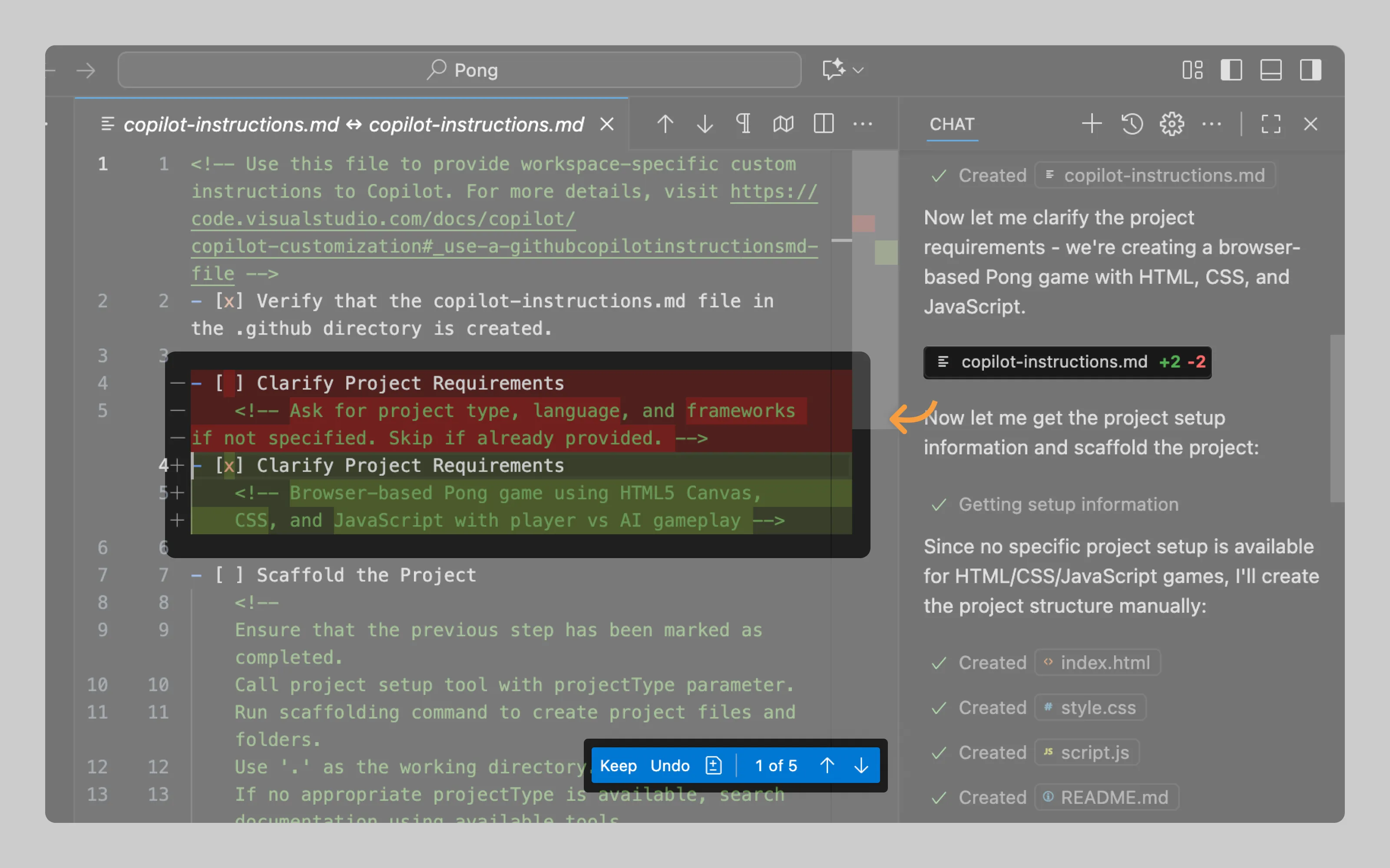 VSCode Copilot diligently records changes down to individual characters alongside workflow steps. Additionally it marks before and after changes in red and green directly within users code. This lets users compare everything to decide if the changes should be kept or rejected. See: Output management