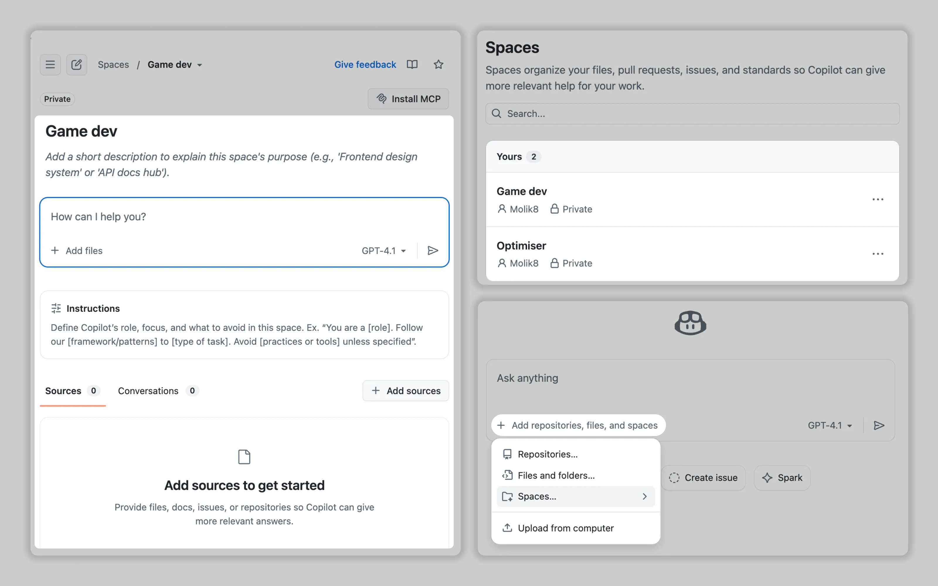 GitHub lets users customize Copilot through dedicated spaces where they add instructions, sources, and even full conversation examples. Users can create multiple spaces and reference them when prompting AI.