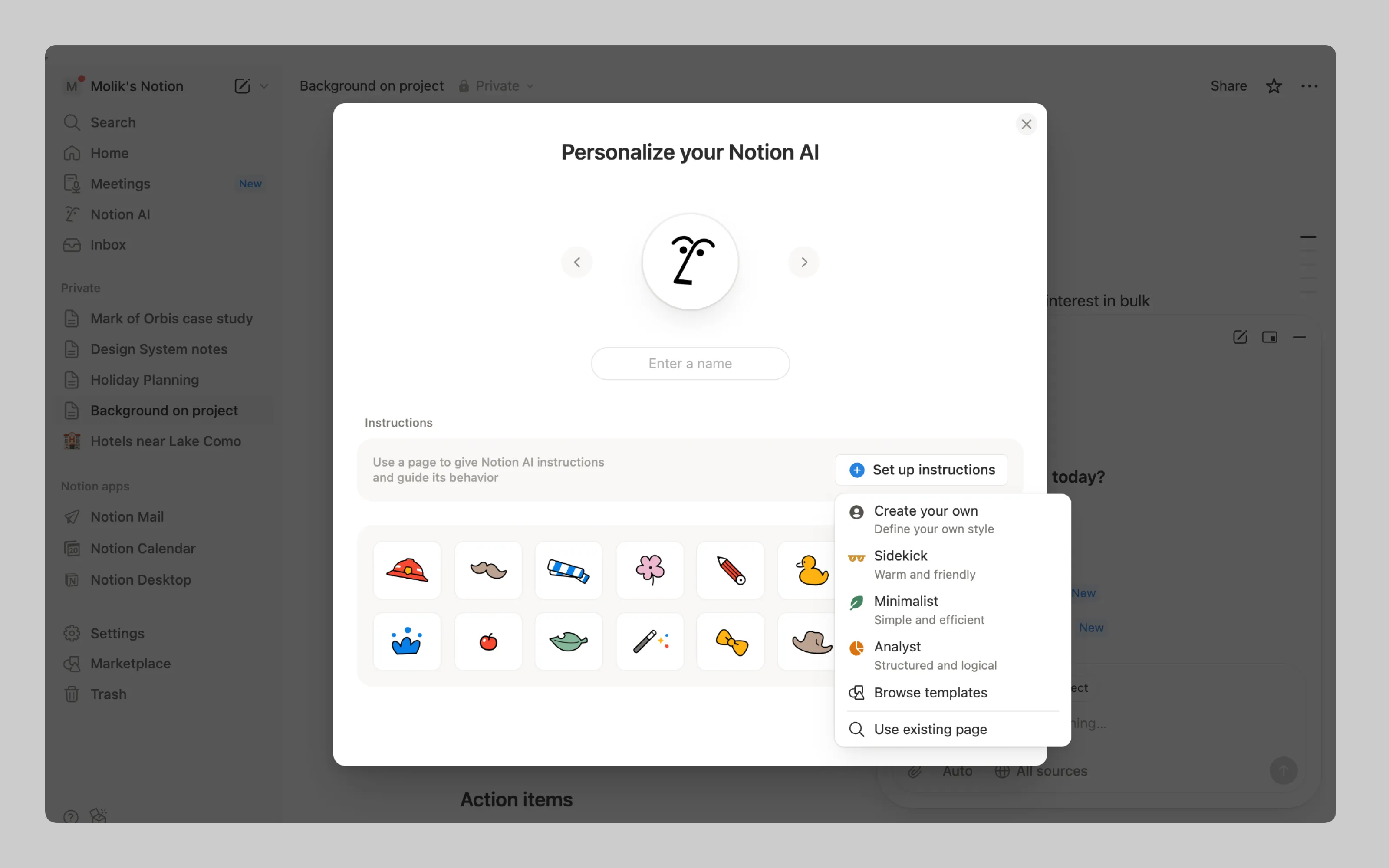 Apart from specialising AI with instructions, Notion also allows users to customise the AI avatar. Cute.