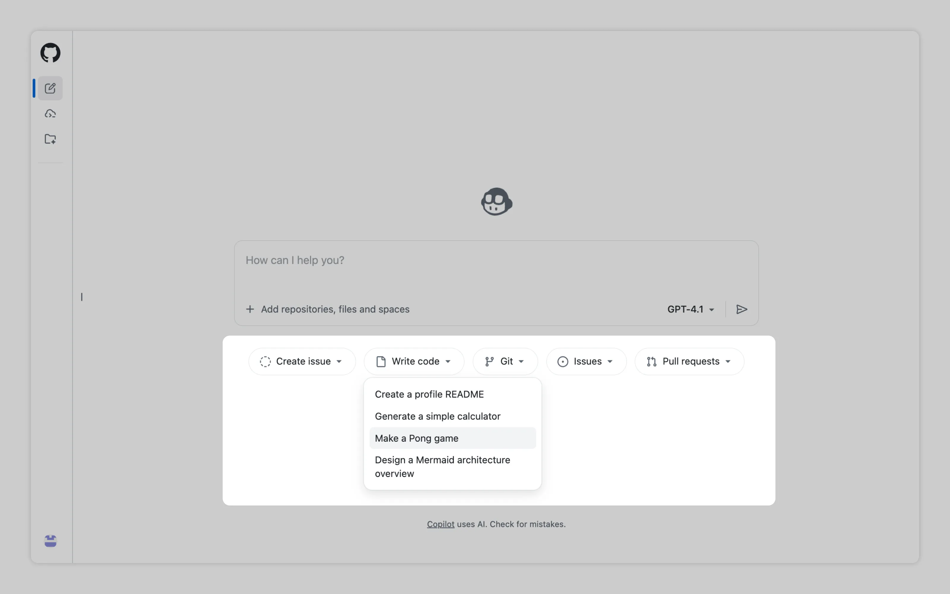Display common or contextually relevant tasks as buttons near the open input. Clicking them instantly fills the input with a prepared prompt and starts generation. Users get immediate value without typing a single word.