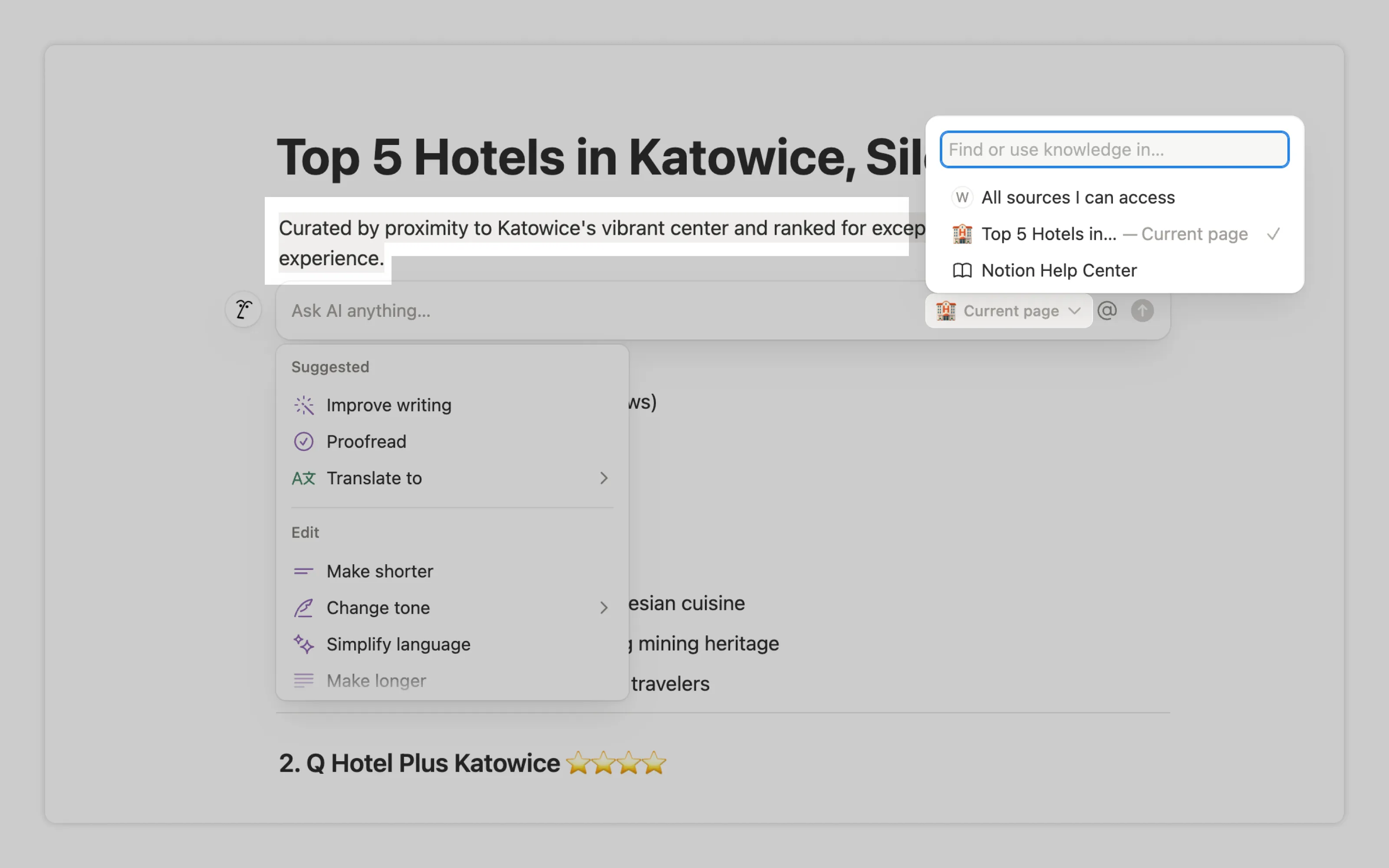 Notion modifies only the selected text while allowing users to include additional context. In this case, it lets them choose which data source the AI can reference.