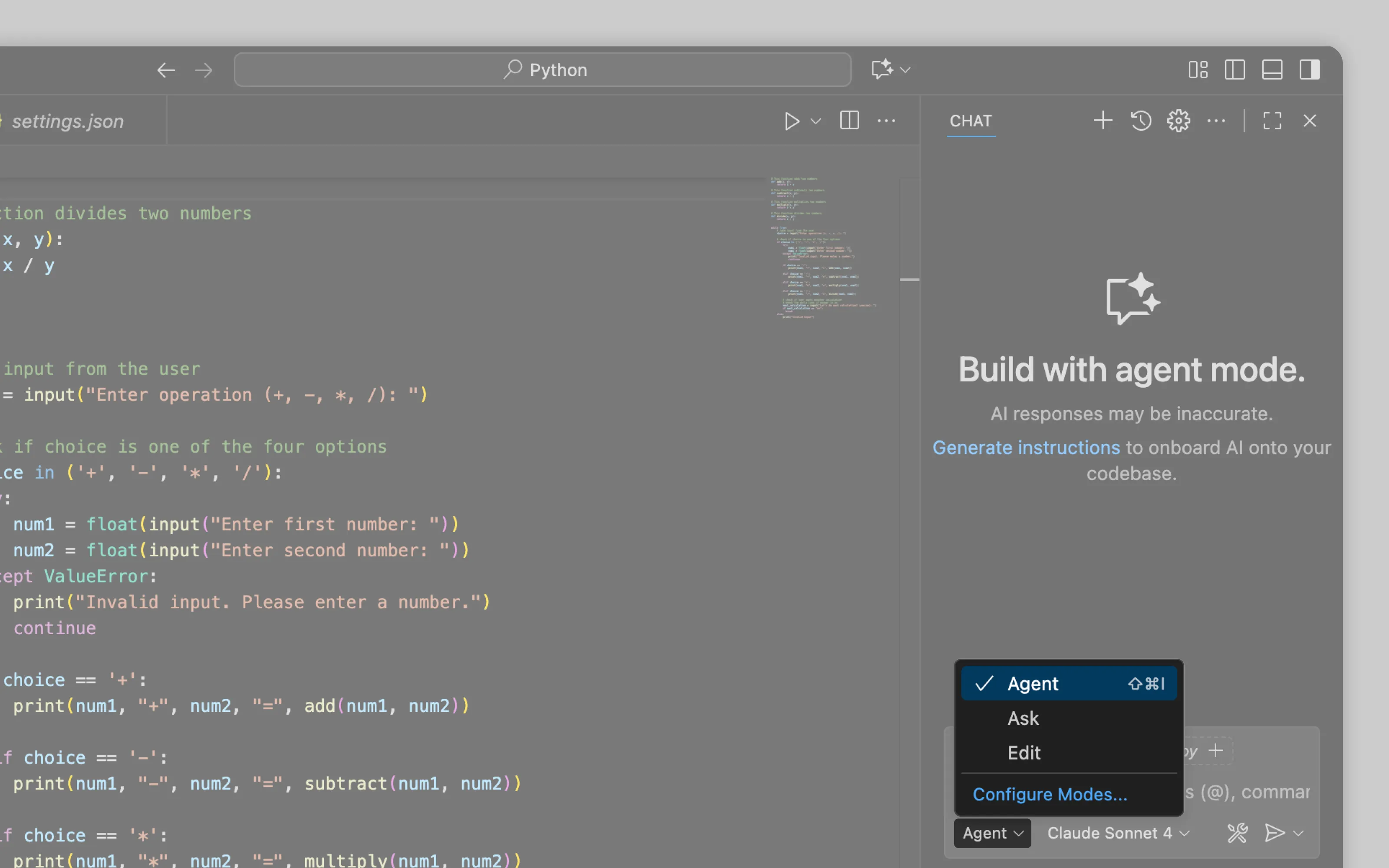 VS Code uses selection parameters to switch AI between three modes, which changes how it works and, as a result, what it produces.