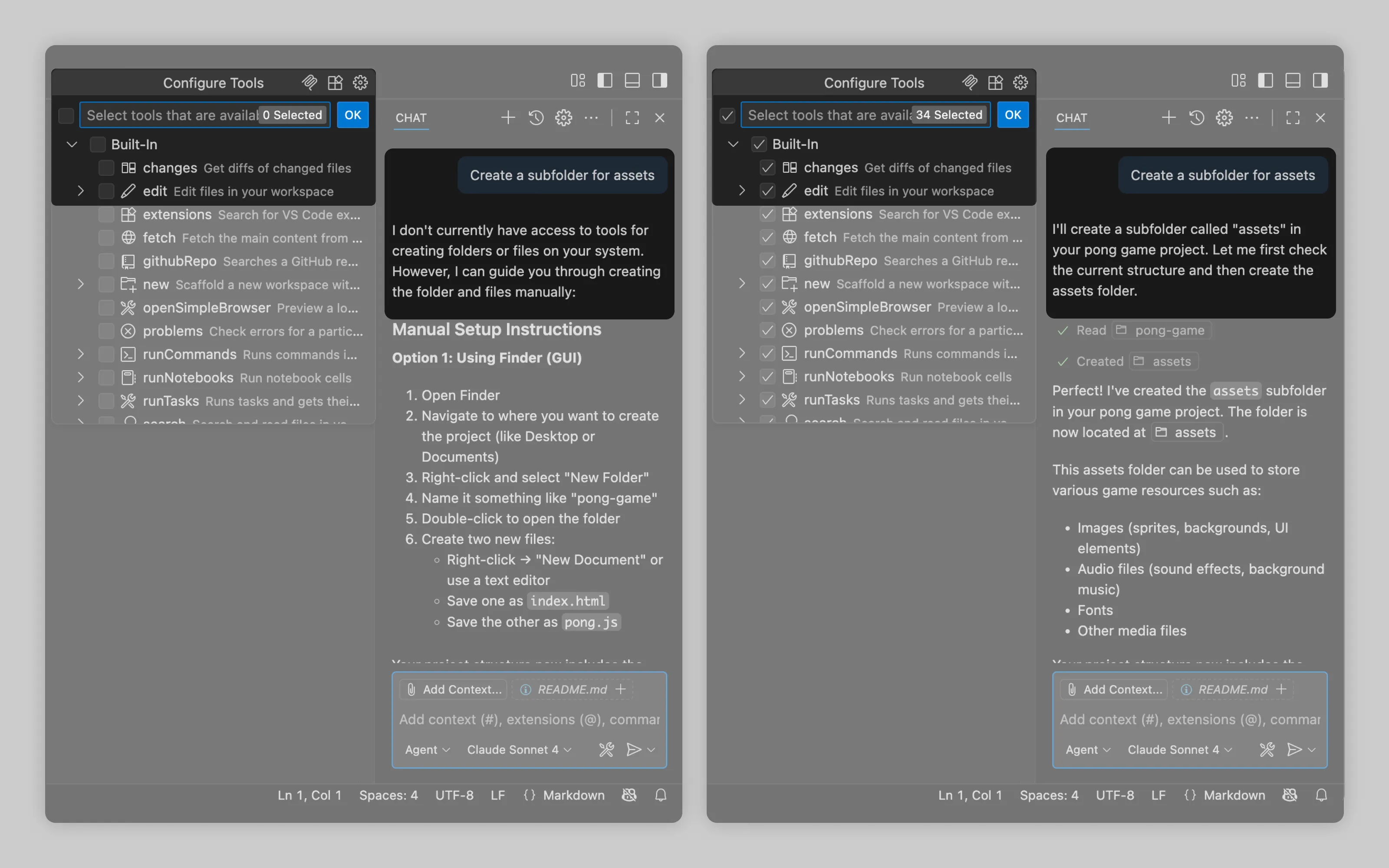 In VS Code, disabling all tools makes AI output into text-only responses. If you ask it to create a folder, it provides instructions on how to do it. With tools enabled, it creates the folder on its own.
