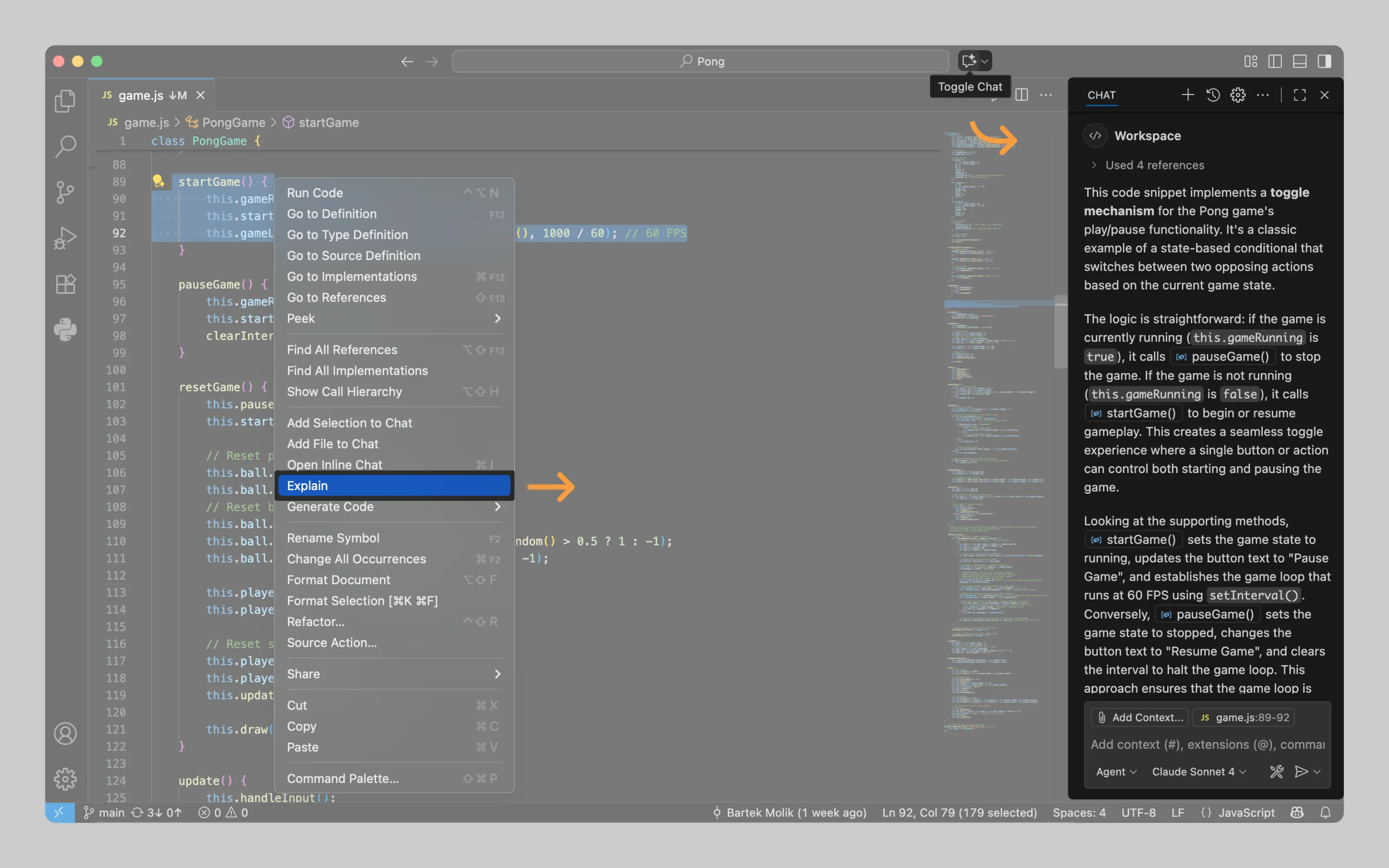 Apart from a dedicated “Open chat” button, VS Code also opens side panels automatically when users select actions that prompt AI to respond through an overlay.