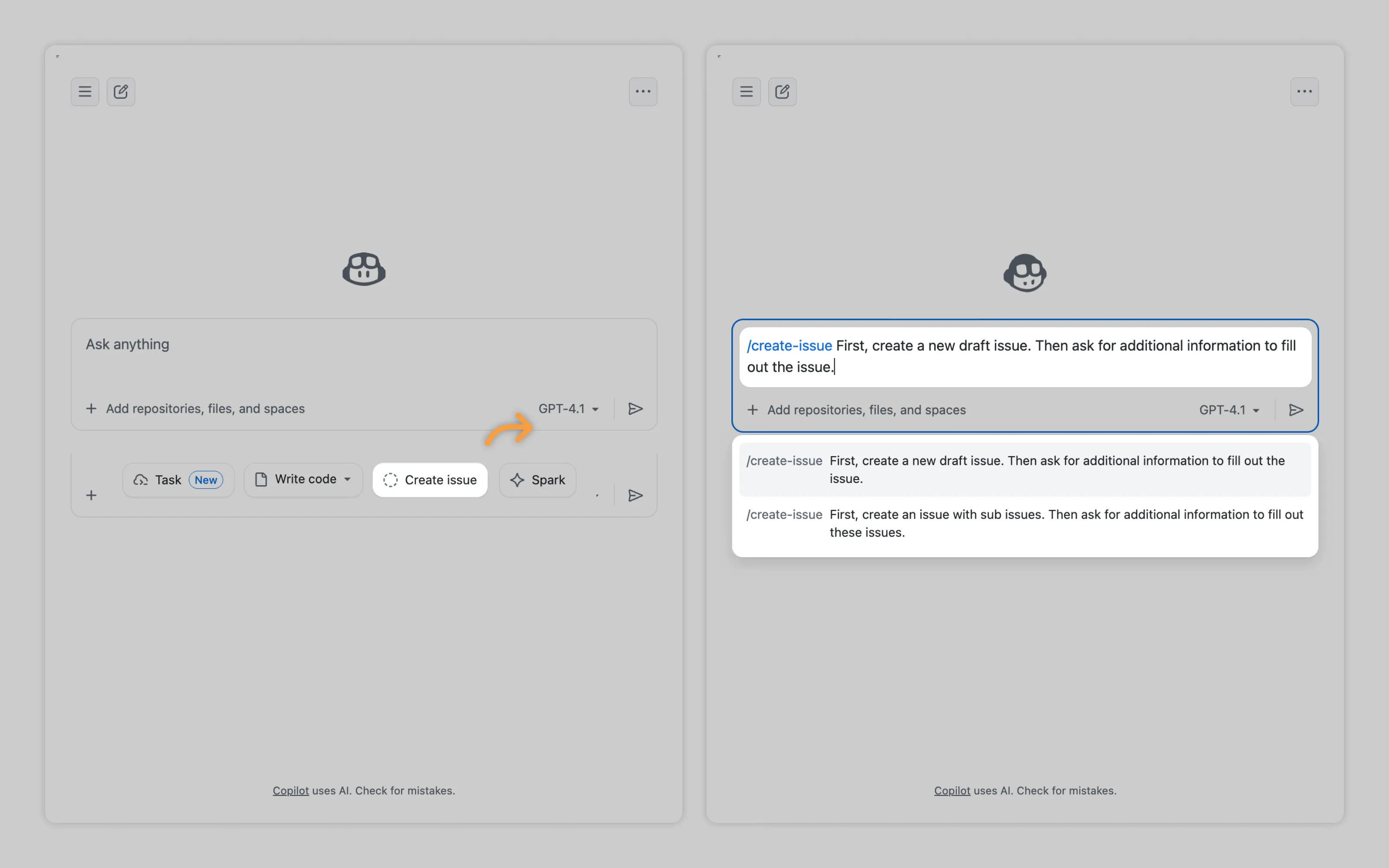 GitHub's "Draft with Copilot" button in the "Create sub-issue" menu fills the input with a started prompt when clicked.